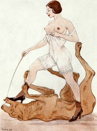 Das Bild zeigt eine der Darstellungen, die in der Jahrhundertwende von 1900 sehr verbreitet waren. Typisch für damals war es, die Frau in Dessous darzustellen (also noch nicht in Leder oder Latex, wie heute oft üblich). Dabei wurde ehre mit der Fantasie gespielt als mit den gängigen Klischees der „Peitschenlady in Leder“, die heute verwendet werden. Die Dominierung - damals wie heute - beruht aber im Wesentlichen darauf, die Rolle der dominanten Frau überzeugend zu spielen.